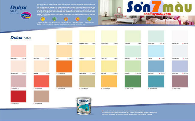Sơn nước Dulux 5 trong 1 cũng như các sản phẩm khác của chúng tôi, sơn Dulux có hệ thống màu sơn vô cùng phong phú và đa dạng, có thể hoàn toàn đáp ứng được tất cả các nhu cầu của khách hàng trên thị trường hiện nay. Vì thế, bạn cứ tha hồ mà lựa chọn màu sắc mà mình ưng ý nhé.